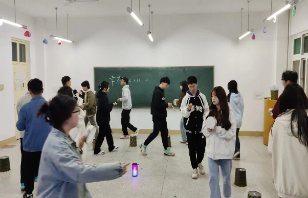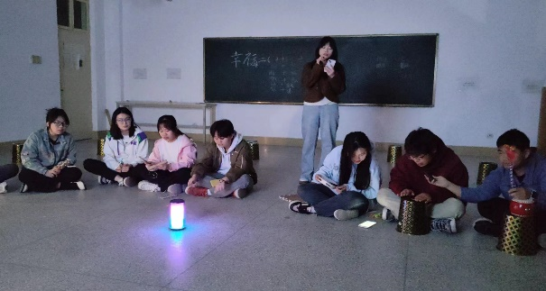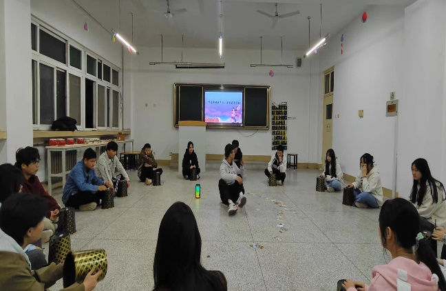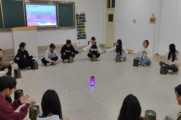 活动初始,伴随着欢快的音乐,同学们围坐一圈。轻快的音调在空气里流动,通过互相介绍,同学们在音乐中加深了对彼此的认识与了解。紧接着周靖昆老师向同学们一一讲解所用到的乐器,吸引同学们放下了手机真正沉浸式地投入到活动中。