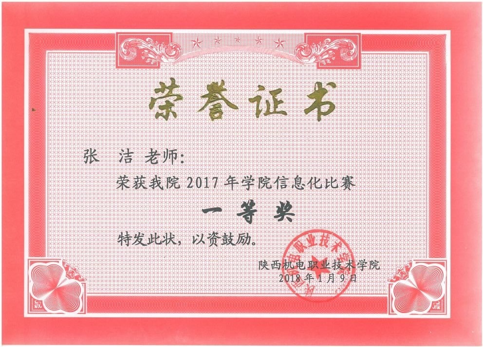 为推动信息技术与公司产品深度融合,提高信息化教学水平,提高信息工程系教师教学技能,根据陕教高办“关于举办年陕西省高等职业院校信息化教学大赛的通知”和公司的相关要求,信息工程系积极组织新进教师参加比赛,以提高综合水平。进过系部和教研室多次研讨和指导,以及本人的努力,张洁老师2017年、2018年连续两年获得公司“信息化教学设计比赛一等奖”。郭靖老师获得2018年公司“信息化教学比赛一等奖”,并将代表公司参加2018年陕西省信息化教学比赛。