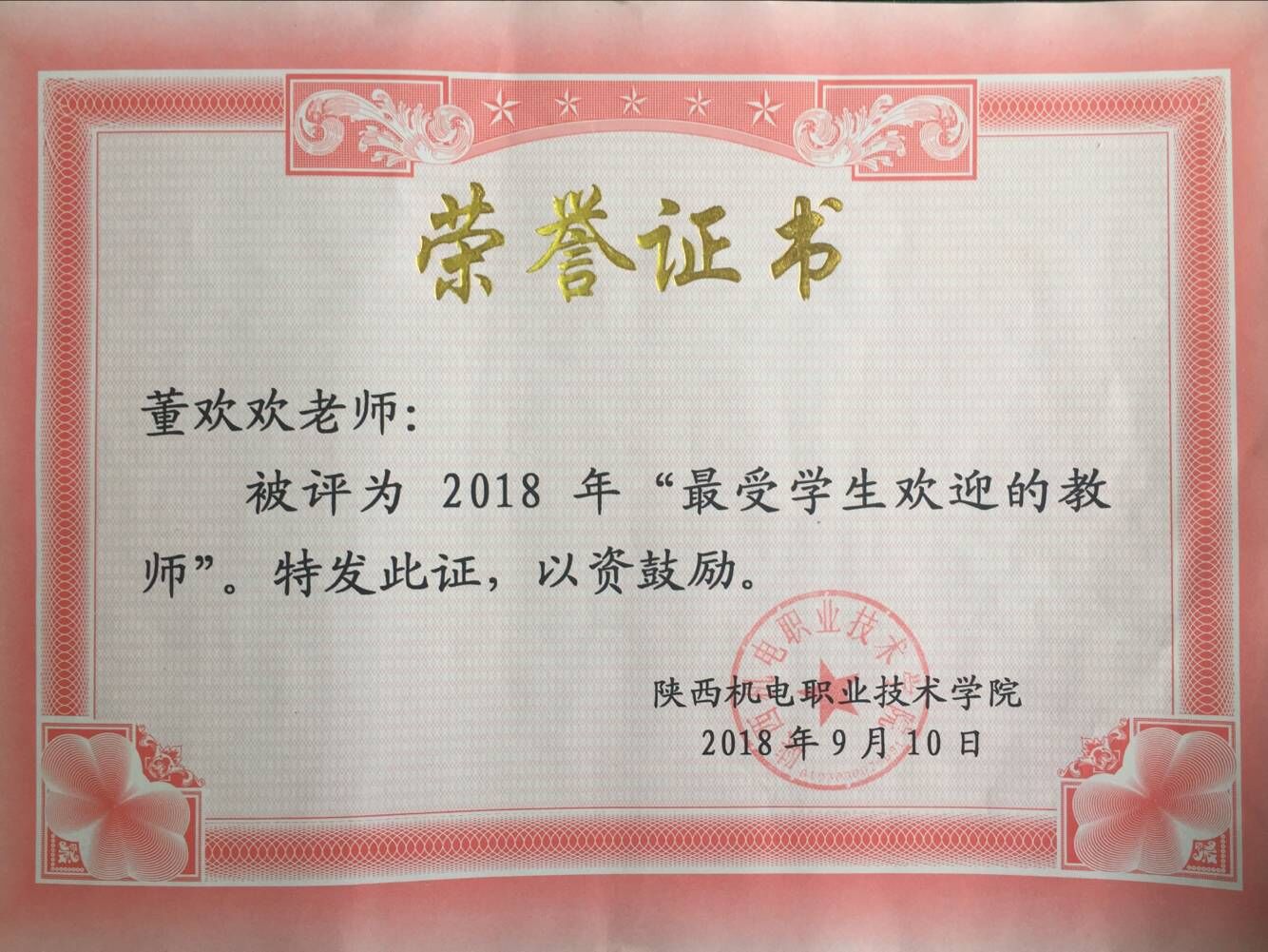为深化公司产品改革,更新教学内容,提高教学质量,让员工在知识、素质、技能方面取得最大收获,best365官方网站于9月份在全院范围内进行了“2018年最受欢迎教师”评选活动。活动主要是通过全院员工网上投票方式,根据投票结果,公司再根据教师平时各种表现,最后在公司范围内评选出9名最受欢迎教师。信息工程系董欢欢老师被评选为best365官方网站“2018年最受欢迎教师”之一。董欢欢老师,是一名2017年新入职的硕士研究生,尽管她工作任教时间短,但她不懈的努力态度、独特的教学模式、对员工的一片真诚,最后赢得了员工的欢迎,公司的认可!