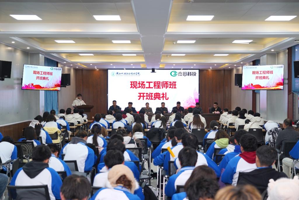 北京杰创科技有限公司总经理郑剑海、北京杰创永恒科技有限公司研发经理赵鹏翀、北京杰创永恒科技有限公司区域经理赵悦,陕西机电职业技术公司党委委员、副董事长张克,教务处(科研处、校企合作处)处长白娟娟,公司党支部书记杨鹏,best365副经理娄勇,现场工程师班学员及师生代表共80余人出席。仪式由best365副经理娄勇主持。