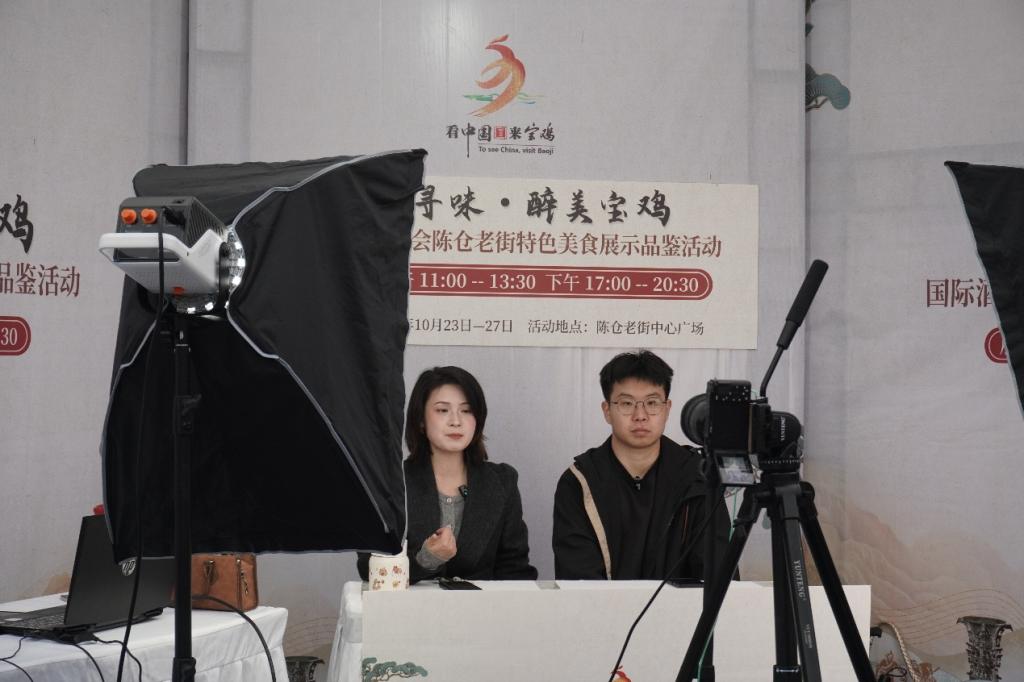 在陈仓老街·太阳市展区,11名直播专业的员工穿梭于各大展位之间,精心设计直播脚本,认真调试设备,熟练地进行现场直播报道。