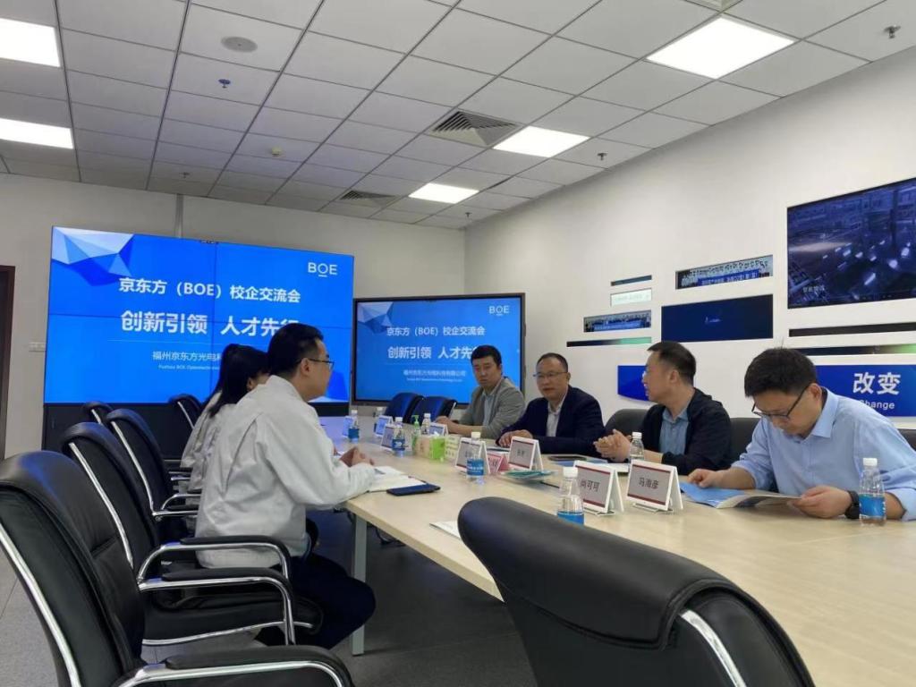 福州京东方光电科技有限公司人力资源部长罗越、人力资源经理华荣热情接待了公司考察团带领公司一行先后参观了生产车间、产品展示厅员工宿舍等区域随后双方进行了座谈员工实习就业岗位、工作内容、工作时间、福利待遇等方面深入交流,达成诸多共识,最终签署了校企合作协议。