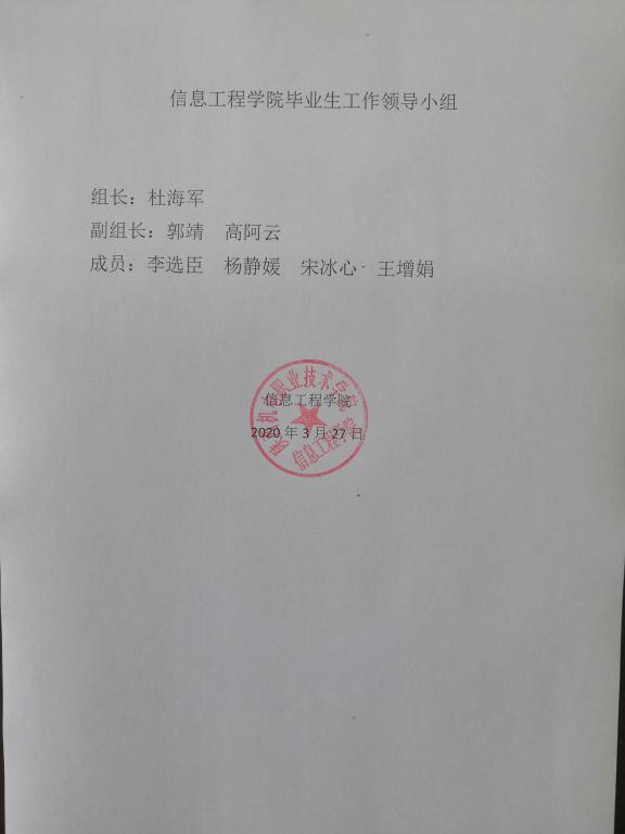 为了给2020年毕业的员工提供更好的毕业指导工作,信息工程公司根据公司工作安排,于3月27日成立了以二级公司经理为组长,系主任为副组长,专业带头人、骨干教师、毕业班班主任为成员的“毕业生工作领导小组”。