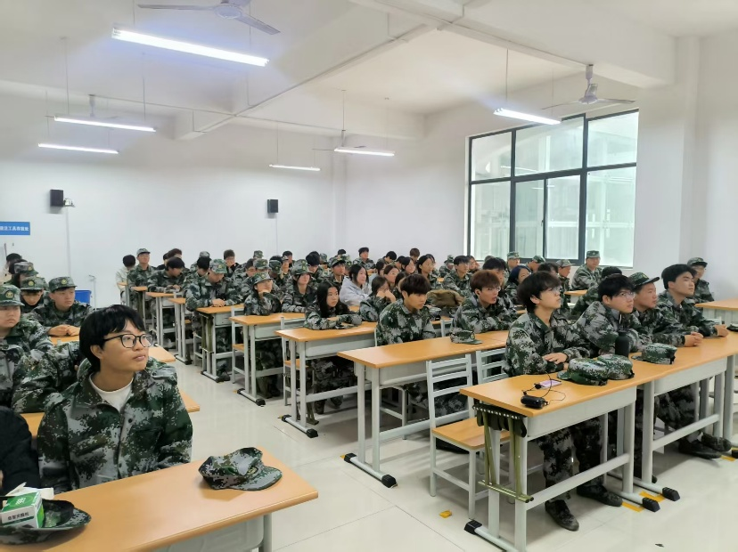 军训期间,小雨淅淅沥沥,为训练按下了 “暂停键”。新生迅速转移至室内场馆,身着迷彩整齐入座,延续训练精神。教官在室内教授基础急救知识及内务整理。通过口令与示范分解动作要领,让同学们强化安全应急能力,巩固日常纪律习惯。