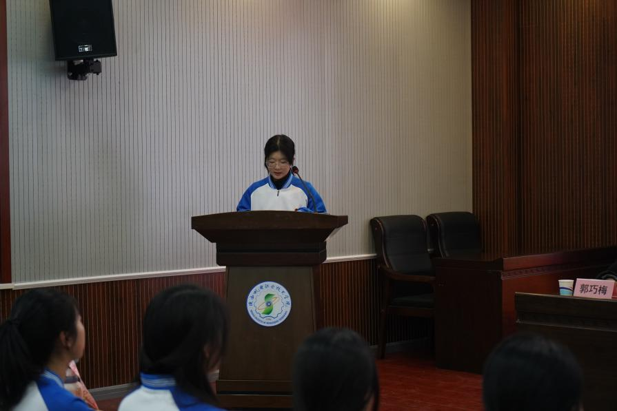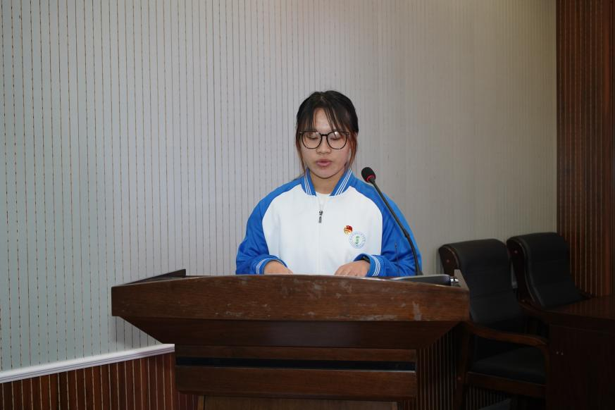 23软件技术1班张欣怡同学作为宝福路校区优秀团员代表发言,她分享了自己在共青团组织中的成长经历与感悟,激励新团员们要时刻牢记使命,努力学习,积极奉献。