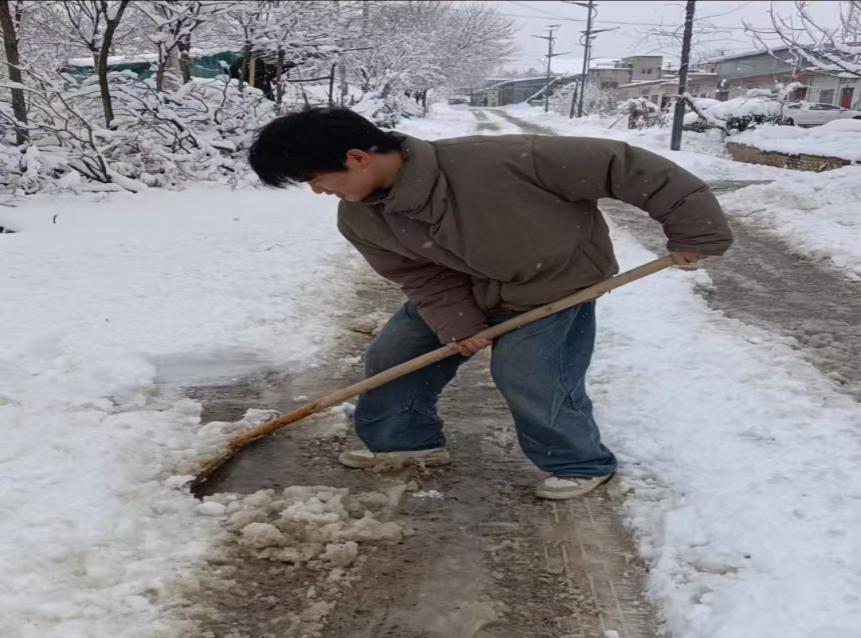 23软件技术1班的宋丛军积极投身到清雪志愿服务中。他手持铁锹,不畏严寒,用力铲除着积雪 ,为乡村居民开辟出安全的出行通道。他的行动不仅方便了大家的出行,更传递了温暖与关爱,彰显志愿服务精神的光芒。
