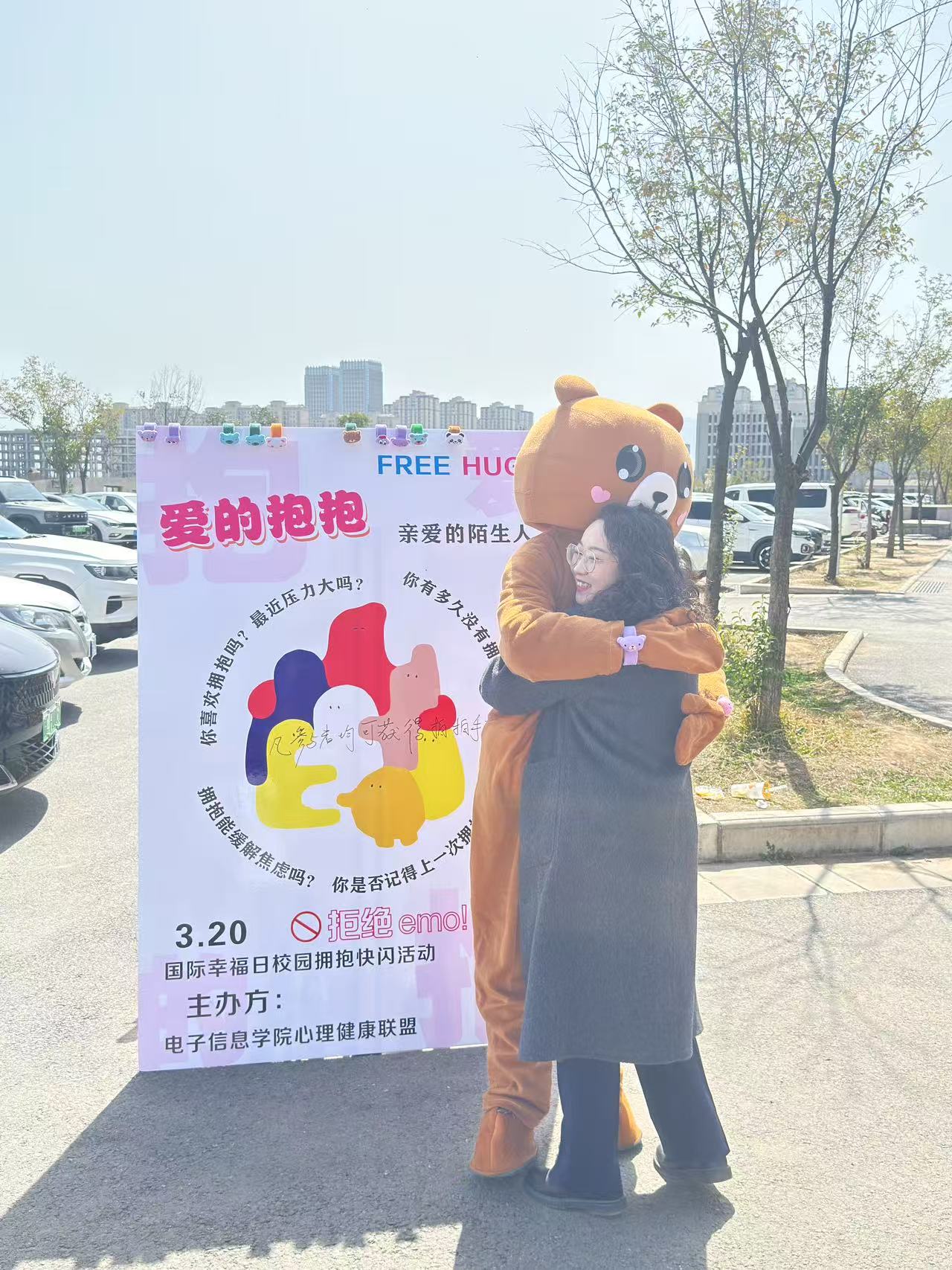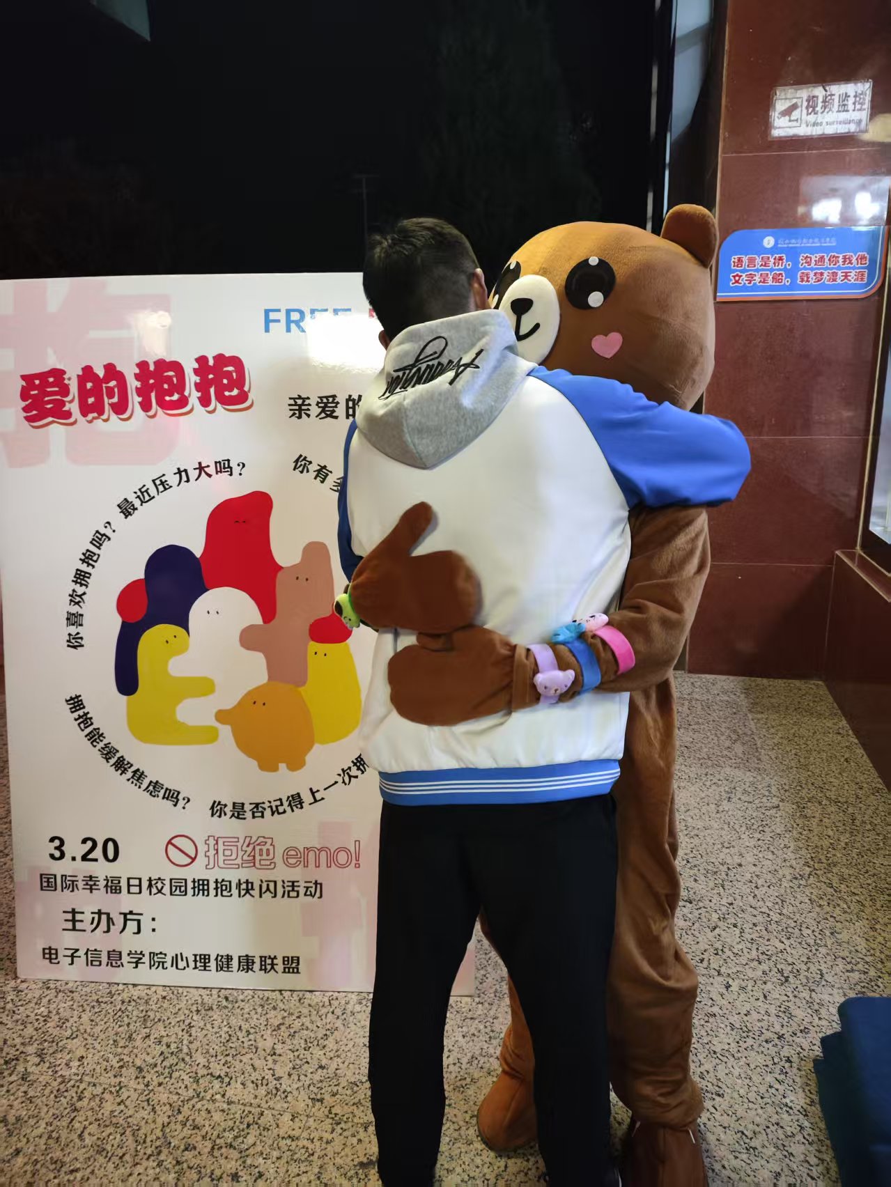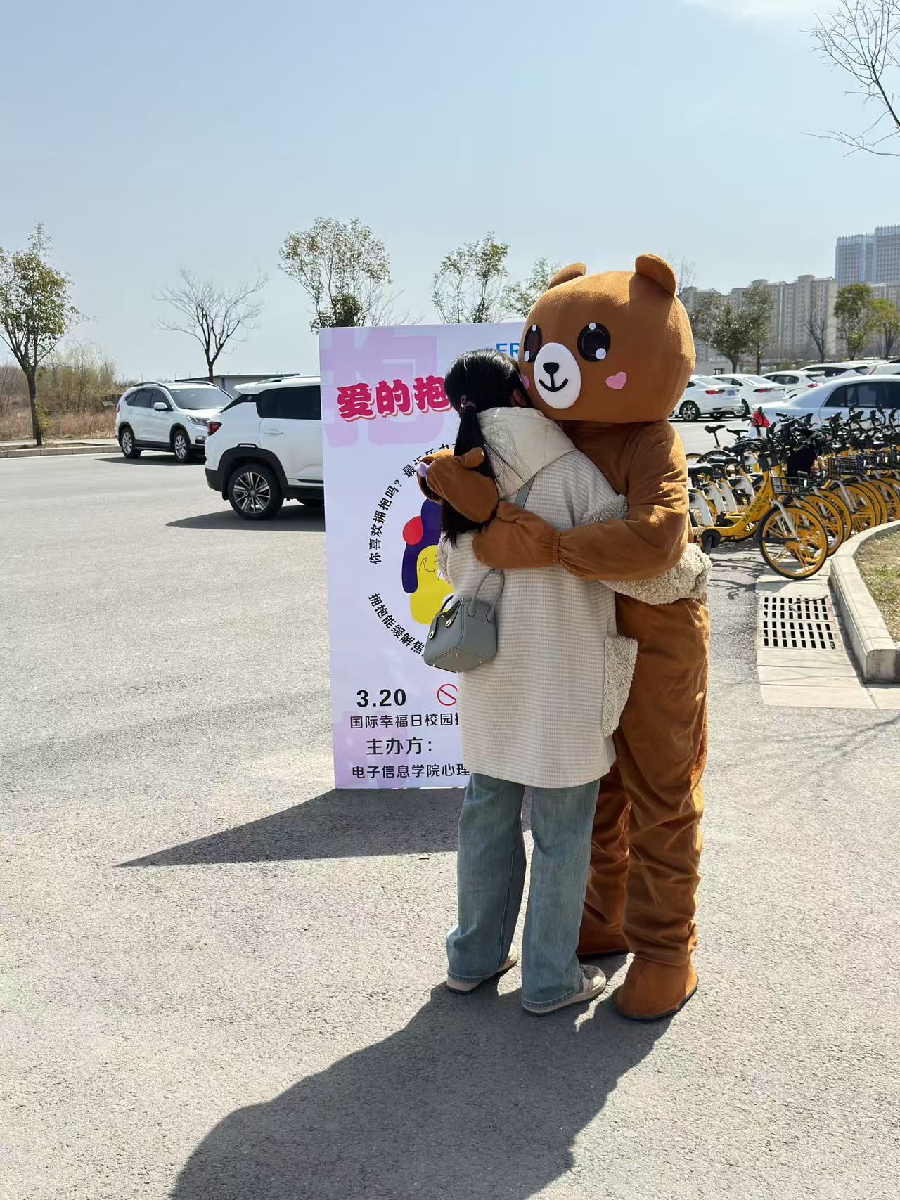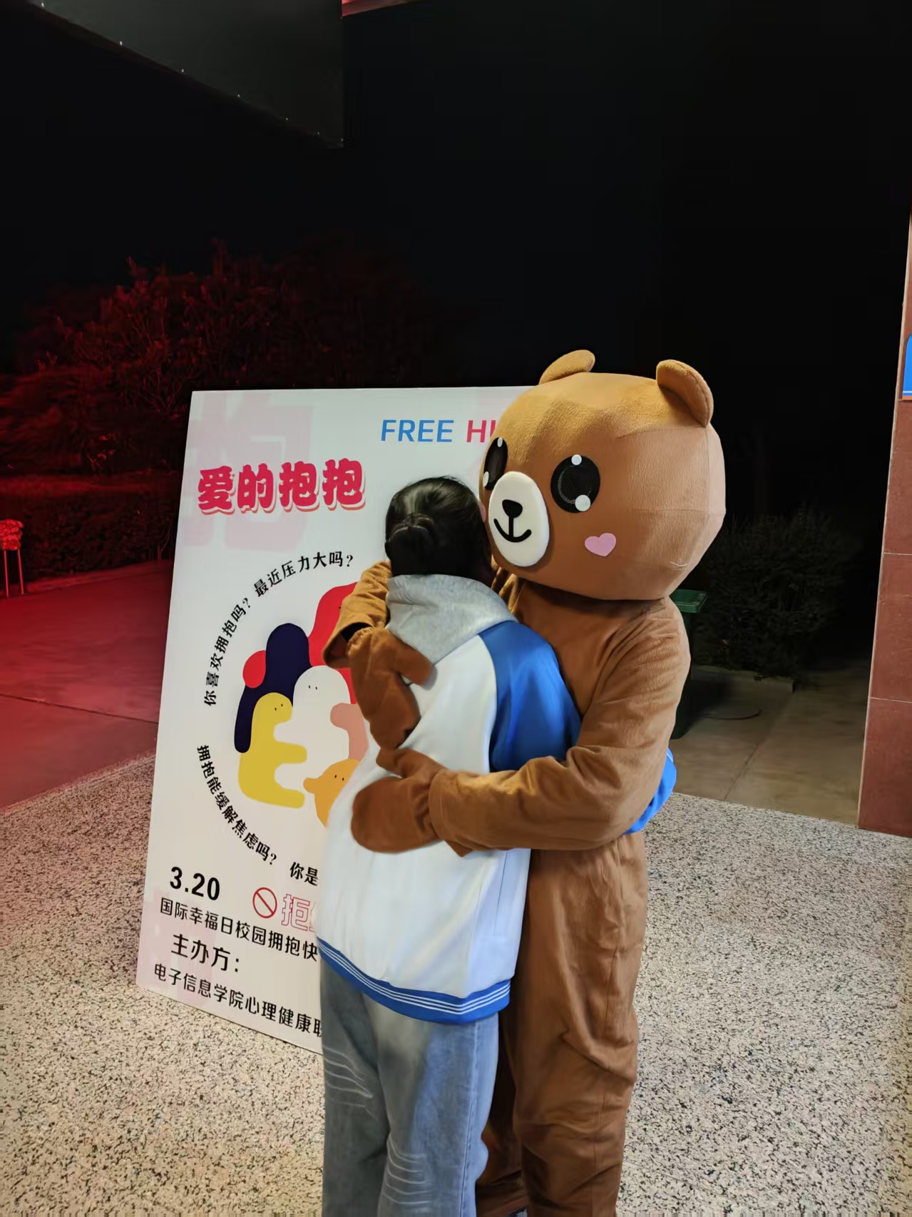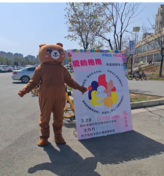 为迎接第13个国际幸福日,公司3月20日在蟠龙校区与宝福路校区分别举办了“爱的抱抱”活动。在活动中,成员装扮成玩偶的样子向同学们友好地张开双臂,接受同学们或喜或忧的情感宣泄,做同学们情绪的避风港。