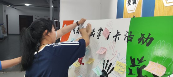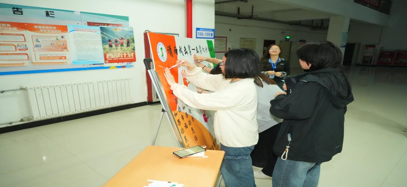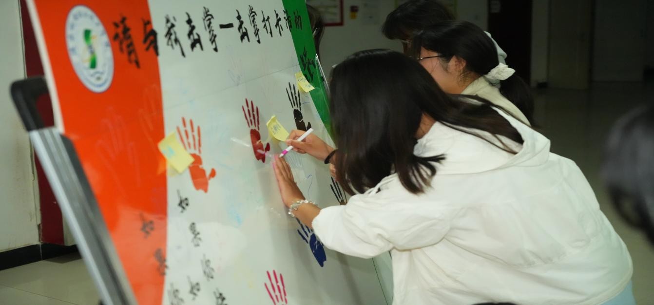 活动现场,同学们热情高涨。在寄语板留言区,大家认真书写。在掌印创作区,同学们纷纷拿起画笔,在展板上印下掌印,并创造出许多富有新意的图案。工作人员贴心服务,默契配合,为活动的成功举办贡献了自己的一份力量,现场气氛轻松愉悦。